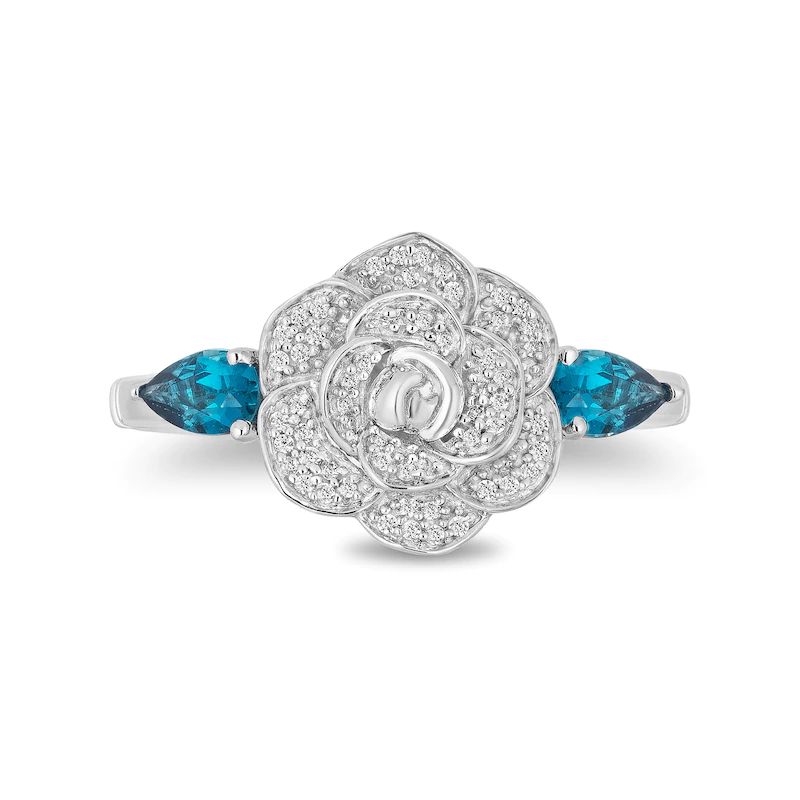 Burstingwithbeauty,thisgemstoneanddiamondflowerringdisplayswonderandelegance.Createdinsterlingsilver,thisstyledazzleswithadiamond-adornedbloomsparklingbetween5.0x3.0mmpear-shapedLondonbluetopaz.Crowninsetsloweronthedenoteaprincess-worthydesign.Captivatingwith0.085ct.t.w.ofdiamondsandabrightpolishedshine,thischoiceisasplendidaddition,aCertificateofAuthenticityaccompaniesthiscollector’seditionpiece.