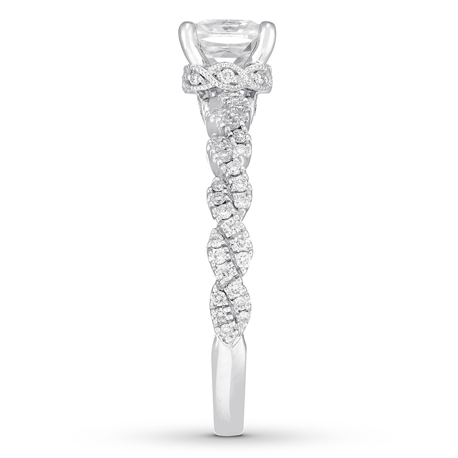 This spectacular engagement ring from Premiere collection features a stunning, modern design enlivened by an impressive array of independently certified diamonds. The brilliant 1-carat, cushion-cut diamond center pairs with dazzling twists of round diamonds on the band for a romantic look. Styled in 14K white gold, the ring has a total diamond weight of 1 1/5 carats.
